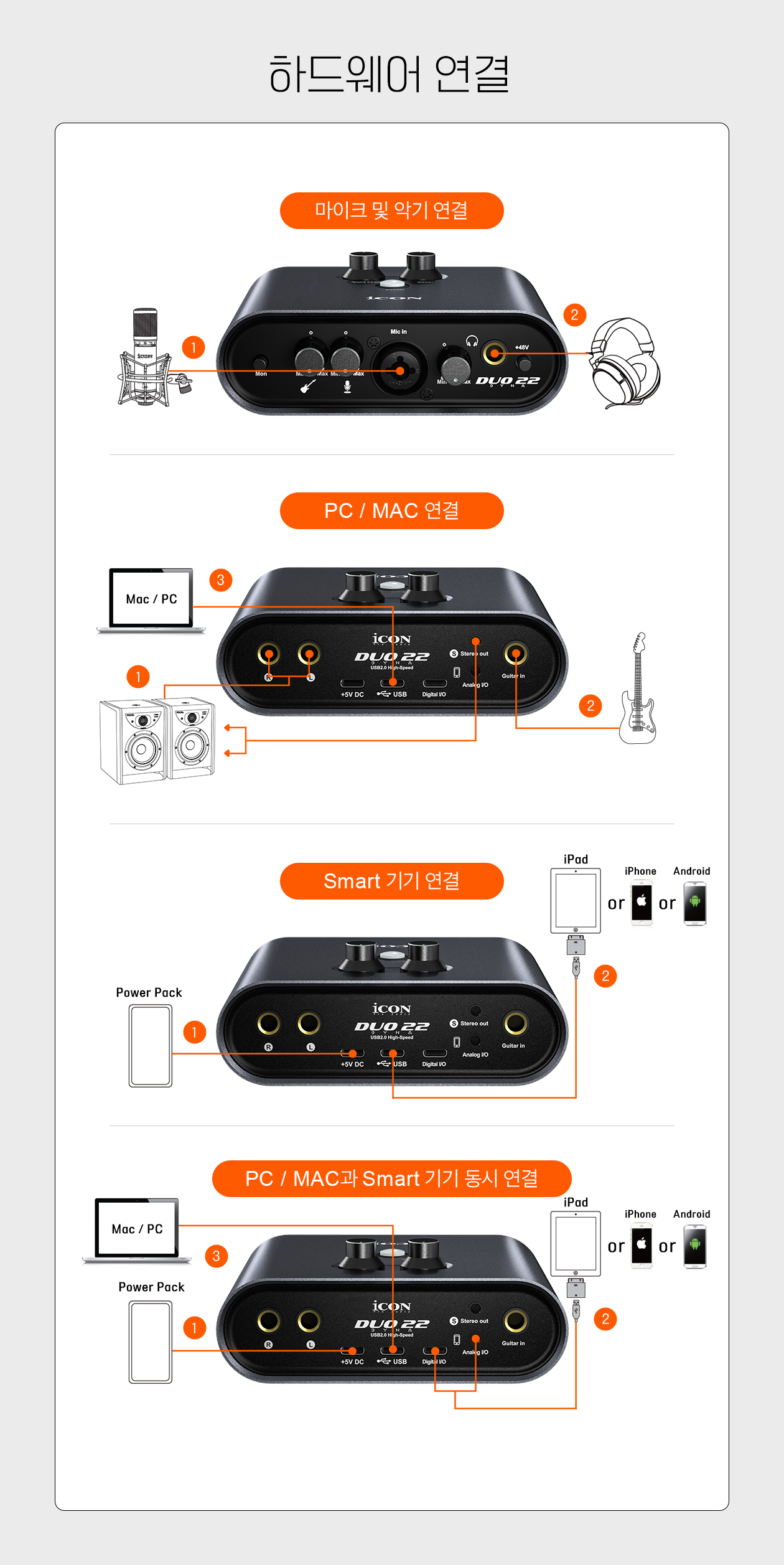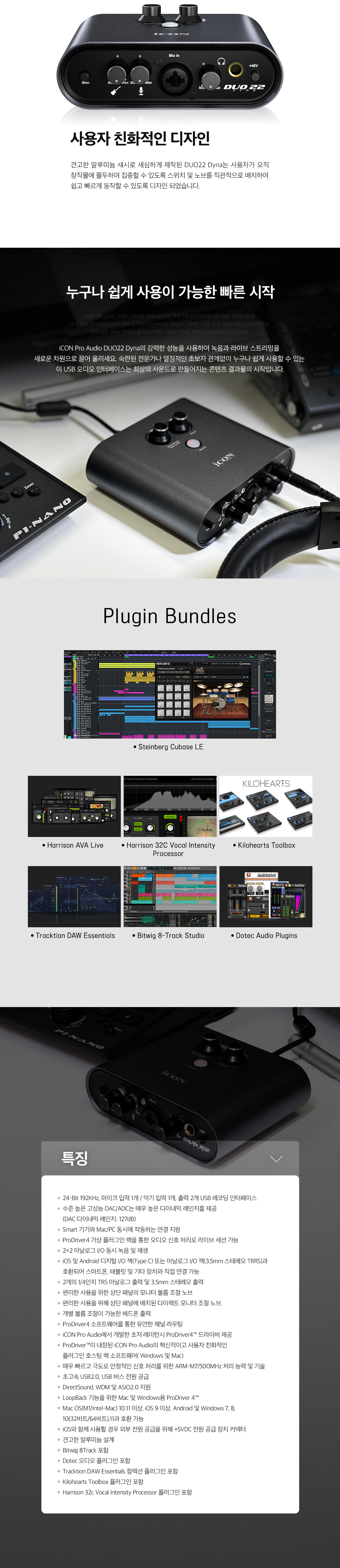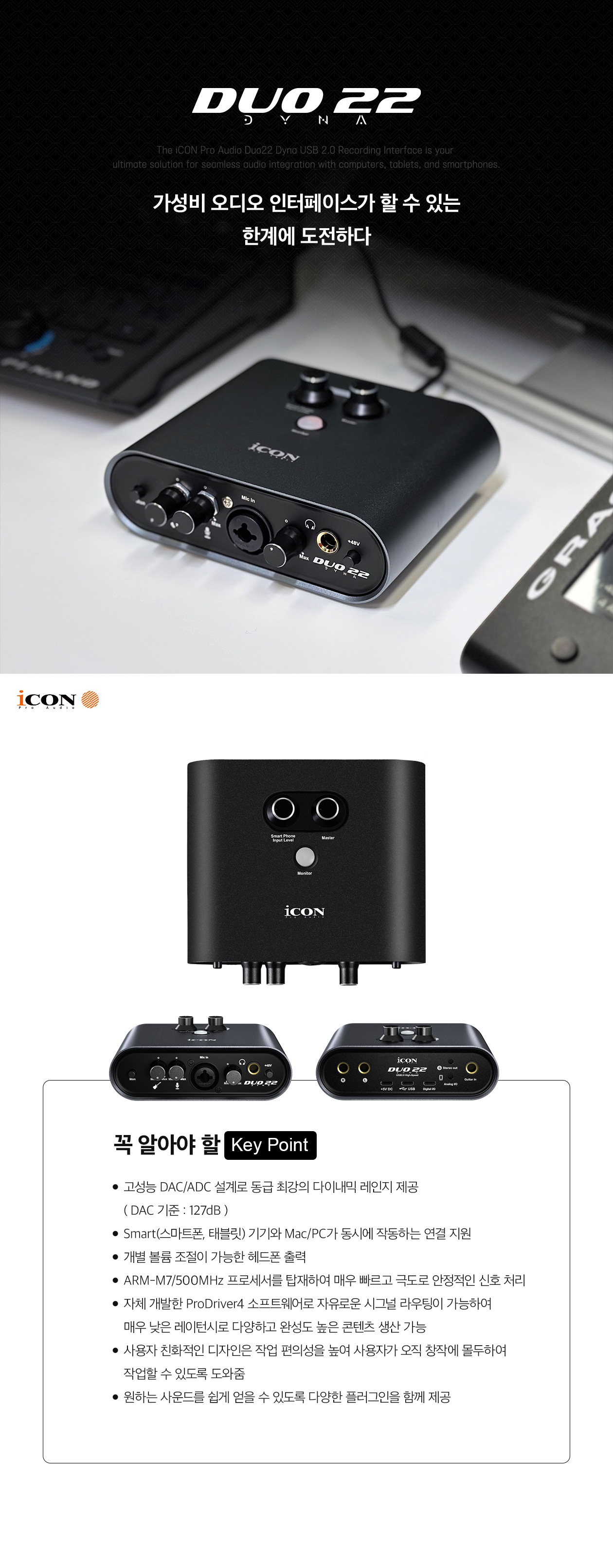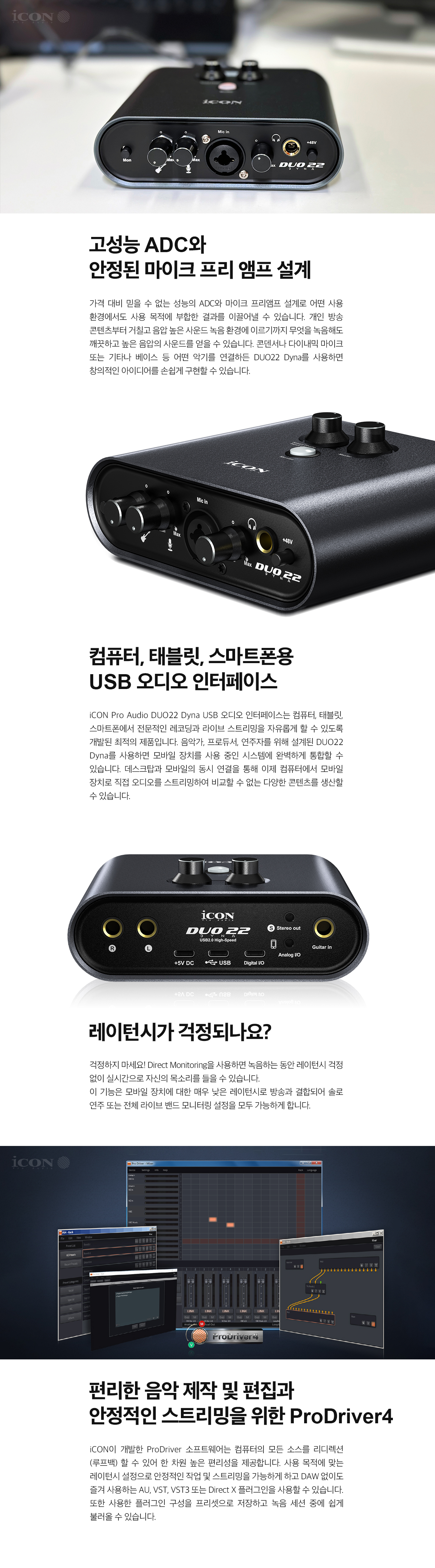 iCON Pro Audio DUO22 Dyna USB 오디오 인터페이스는 컴퓨터, 태블릿, 스마트폰에서 전문적인 레코딩과 라이브 스트리밍을 자유롭게 할 수 있도록 개발된 최적의 제품입니다. 음악가, 프로듀서, 연주자를 위해 설계된 DUO22 Dyna를 사용하면 모바일 장치를 사용 중인 시스템에 완벽하게 통합할 수 있습니다. 데스크탑과 모바일의 동시 연결을 통해 이제 컴퓨터에서 모바일 장치로 직접 오디오를 스트리밍하여 비교할 수 없는 다양한 콘텐츠를 생산할 수 있습니다.