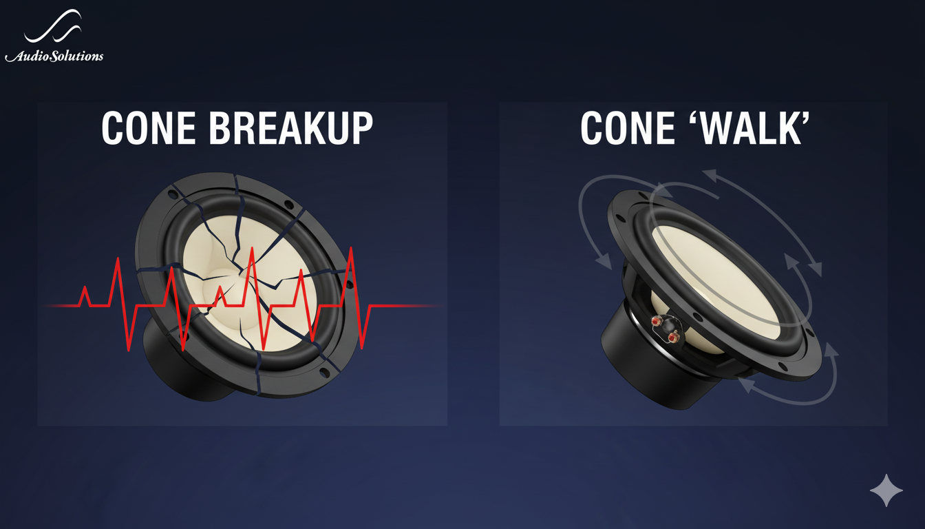 두 번째로, 돔의 앞면과 뒷면 사이에 순간적으로 발생하는 압력 차이가 진동판을 제어하는 서스펜션의 능력을 넘어서게 됩니다. 이로 인해 돔 전체가 축을 벗어나 불안정하게 흔들리는 콘 워크(Cone "Walk") 현상이 나타나며, 이 또한 음질을 저하시키는 주요 원인이 됩니다.
